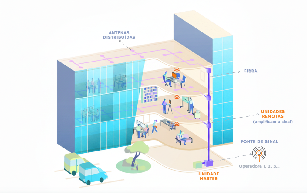 As antenas são estrategicamente posicionadas em áreas de alta circulação, corredores, subsolos, áreas de lazer, entre outras — locais onde falta capacidade e/ou cobertura do sinal de celular que vem de fora do empreendimento.